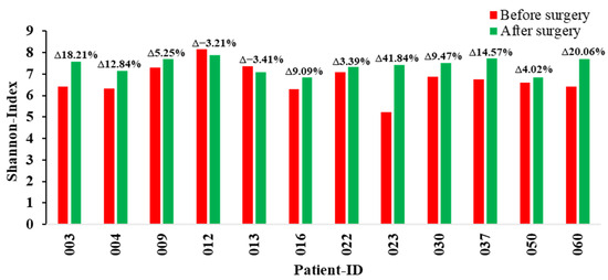 The Shannon diversity index both takes richness (number of different taxa) and evenness (equal distribution of taxa) into account [43,67] and the values were compared before and after surgery, revealing a notable increase in diversity for nine out of eleven patients, extending from 3 to 42% (Figure 5). On average, the index experienced a 10% increase, rising from 6.7 to 7.4 after the surgery. Interestingly, a decrease in the Shannon diversity index was only observed in patients 012 and 013, who had the highest initial indices before surgery.