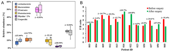 (A) Box–whisker plot of the major phylum groups Actinobacteria, Bacteroidetes, Firmicutes, and Proteobacteria. Phylum < 2% and the unspecific bacteria of the patients (P-ID 003-060), as well as the percentage delta of each median, are shown above the box plot groups. The left boxes (bright colors) represent the relative abundance of the phylum before surgery and the right boxes (pale colors) show the values after bariatric surgery. (B) Ratio of the relative abundance of the gut microbiome phyla Firmicutes to Bacteroidetes. Depicted are data of patients before (green columns) and after (red columns) bariatric surgery (P-ID 003-060). The percentage difference in the F/B ratio of the patients from before and after bariatric surgery is shown above the columns.