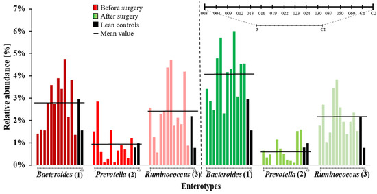 One element of the human intestinal microbiome that can be influenced by diet is the enterotype, first introduced by Arumugam et al. in 2011 [49]. These states can be identified by their most prominent relative abundance of the genera Bacteroides (Enterotype 1), the Prevotella-enriched enterotype 2, and, in this study, the most viable Ruminococcus enterotype 3 [49]. Enterotype 1 enriched with Bacteroides was linked to a high protein and animal fat diet, whereas the Prevotella enterotype 2 was related to a diet with a great amount of carbohydrates [50]. Previous studies have demonstrated that these enterotypes tend to be relatively stable over extended periods of time. In an analysis based on two single collection points during the Human Microbiome Project [97], it was found that 84% of individuals did not switch their enterotype [51]. Over our cohort of twelve severely obese females, a broad variation in enterotypes can be observed, with seven patients belonging to the first enterotype, four clustering into enterotype 2, and only one into enterotype 3 before bariatric surgery. Furthermore, we revealed a significant number of four total changes in enterotypes post-surgery, divided into three alterations from the Ruminococcus-enriched enterotype 3 pre-surgery to enterotype 1 containing mostly Bacteroides, as is true for the control volunteers.