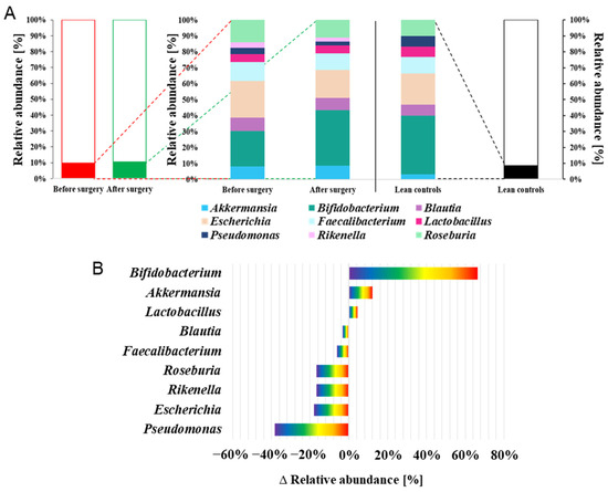 The largest effect (delta (∆) relative abundance) of 66% was observed for Bifidobacteria, which are widely recognized and extensively discussed probiotic bacteria. They were drastically underrepresented before bariatric surgery but showed a substantial increase after surgery, not only approximating but even slightly surpassing the mean relative abundance within the healthy lean controls (Figure 8A). Compared to this, the second group of well-established probiotics, the Lactobacilli, only exhibited a marginal rise of 4% (Figure 8B). The positive development of the microbiomes, indicated by the increase in Bifidobacteria, appeared to be consolidated by a simultaneous increase in the genus Akkermansia. This includes A. muciniphila, which is at the moment frequently proclaimed as the upcoming next relevant probiotic [68] due to its association with a healthier metabolic status and better clinical outcomes following calorie restriction in overweight/obese adults [54]. The opposite of the scale of alterations (i.e., decline) in relative abundance was marked by the genus Pseudomonas, which can include notable opportunistic human pathogens (e.g., P. aeruginosa), even completely disappearing from the microbiomes of four patients. A similar effect was observed for Escherichia, which were reduced after surgery, precisely meeting the mean values of this genus in the lean control healthy volunteers. Interestingly, the genus Roseburia considerably declined after surgery and weight loss by 17%, also strongly narrowing the gap with the abundance observed in the healthy control group (Figure 8A). Members of the genus Roseburia have been demonstrated to play a role in regulating gut barrier homeostasis [69], a function that may lose importance within the physiological background of a “healing” microbiome following bariatric surgery and weight reduction.