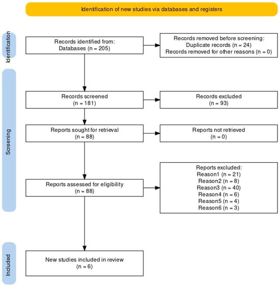 The literature search initially identified 205 records in six databases: 16 in PubMed, 159 in the Cochrane Central Register of Controlled Trials (CENTRAL), 9 in ScienceDirect, 15 in Scielo, 4 in the Virtual Health Library (BVS) and 2 in the Physiotherapy Evidence Database (PEDro). Of these, 24 were duplicates. After screening the titles, abstracts and full text of the remaining 181 studies, 93 articles were excluded, and the full text of 88 publications was screened (reason 1: not RCT; reason 2: not written in Portuguese or English; reason 3: sample without pregnant women; reason 4: sample without pregnant women with overweight or obesity; reason 5: the intervention without PA or exercise; reason 6: outcomes without quality of life evaluation), from which six randomized controlled clinical trials were selected for inclusion in the review, and none of the selected articles were written in Portuguese. Figure 1 shows the process of searching for and selecting the studies in accordance with the PRISMA statement [22].