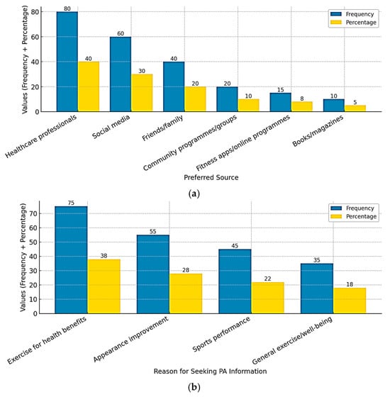 As shown in Figure 1a, healthcare professionals were the most cited source of PA information (40%), followed by social media (25%) and friends/family (16%). Participants reported various motivations for seeking PA information, with health benefits being the most common (36%), followed by appearance improvement (27%) and sports performance enhancement (22%) (Figure 1b).