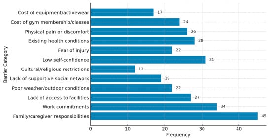 Participants reported multiple barriers to PA participation, with time constraints emerging as a predominant challenge. Family responsibilities (45%) and work commitments (34%) were the most frequently cited barriers, followed by environmental challenges such as limited access to facilities (27%) and poor weather conditions (22%). Psychological barriers, including low self-confidence (31%) and fear of injury (22%), further impeded PA engagement. Additionally, financial constraints, such as the cost of gym memberships (24%) and activewear (17%), were notable (Figure 2 and Table 2).