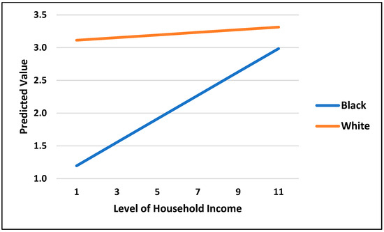 In reporting our results, we refer to Table 2 and Figure 1 and Figure 2. This table and these figures allow us to interpret our findings in relation to our hypotheses. Table 2 displays the OLS regression coefficients along with levels of statistical significance (p-values). Interaction effects are also statistically presented in Table 2 (Models 2 and 4). Figure 1 and Figure 2 visually depict interaction effects among key variables using line graphs. As anticipated, Model 1 in Table 2 indicates that African American women in our sample report significantly lower levels of breastfeeding network prevalence than their White counterparts net of statistical controls (β = −1.216 and p < 0.001). Additionally, the regression coefficient for household income is positive (β = 0.129) and statistically significant at the 0.05 level. Based on these results, Model 2 in Table 2 and Figure 1 further explore the interaction effect of race and income. Figure 1 provides compelling visual evidence of the intersection of race and household income in relation to breastfeeding network prevalence. Specifically, the predicted value of breastfeeding network prevalence increases with each unit increase in household income, controlling for race and other sociodemographic characteristics. However, the effect of increased household income on breastfeeding network prevalence is more pronounced for African American women than for White women on the Mississippi Gulf Coast. This contrast is evident through the distinct slopes shown in Figure 1, along with the statistically significant coefficient in Model 2 (β = 0.159 and p < 0.01).