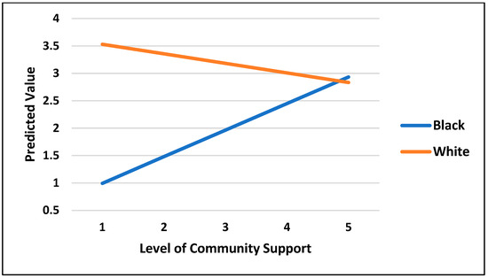 Table 2 also features two additional models (Models 3 and 4) that examine the associations between race, community support for breastfeeding, and breastfeeding network prevalence. The negative association for African American women and the positive association for household income in Model 3 largely mirror those presented in Model 1. However, the community support for breastfeeding variable in Model 3 is significantly and positively associated with lactation network prevalence (β = 0.264 and p < 0.01). Additionally, Model 4 and Figure 2 further test the interaction effect of race and community support on breastfeeding network prevalence. As displayed in the table, the interaction effect is statistically significant (β = 0.659 and p < 0.01), which is visually illustrated in Figure 2. As depicted in Figure 2, there is a racial crossover effect, where community support for breastfeeding predicts lactation network prevalence differently for African American and White women. Specifically, the regression slope for community support is positive for African American women but negative for White women. These regression results collectively support our intersectionality hypotheses involving gender, race, economic status (social class), and community support in the context of breastfeeding. In summary, Black women in higher-income homes and those who perceive greater community support for lactation report more robust breastfeeding network prevalence, comparable to their White peers. Constrained income and low community support significantly inhibit breastfeeding network prevalence among Black women.
