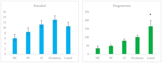 Mean salivary progesterone and estradiol levels across groups (pg/mL); * denotes statistically significant difference.