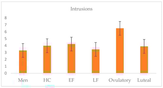 The mean number of intrusions across participants was 4.06 (SD = 3.13), with a range from 0 to 12 (95% CI: 3.55–4.57). Participants (including untransformed outliers) reported a total of 649 intrusions over the 5-day period; 91.16% reported at least one intrusion. A one-way ANOVA illustrated that a significant group effect was observed: F (5,146) = 2.28; p = 0.050; η2 = 0.07. Post hoc tests using Fisher’s LSD revealed that the ovulatory group (M = 6.5, SD = 3.48) differed significantly from all other groups: early follicular (M = 4.17, SD = 3.25; d = 0.69), late follicular (M = 3.45, SD = 2.67; d = 0.98), and luteal phrases (M = 4.05, SD = 3.03; d = 0.75), HC users (M = 3.98, SD = 3.31; d = 0.74), and men (M = 3.30, SD = 2.55; d = 1.05). The mean number of intrusions across groups is plotted in Figure 3.