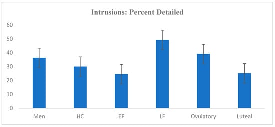 Of all the intrusions reported, 386 (59.48%) were gist memories, and 263 (40.52%) were detailed memories. The number of intrusions was positively correlated with the percentage of detailed intrusions (r = 0.221; p < 0.001); the number of intrusions was not significantly correlated with the percentage of gist intrusions (r = 0.061; p = 0.441). On average, 33.08% (SD = 35.00) of a participant’s intrusions were classified as detailed rather than gist memories. Among the participants in the EF phase, an average of 24.61% (SD = 32.87) of intrusions were detailed; in the late follicular phase, 49.25% of intrusions were detailed (SD = 44.22); in the ovulatory window, 39.08% of intrusions were detailed (SD = 27.01); in the luteal phase, 25.21% of intrusions were detailed (SD = 23.94); in HC users, 30.00% of intrusions were detailed (SD = 33.63); and in men, 36.34% (SD = 39.86) of intrusions were detailed. A one-way ANOVA revealed no significant difference across groups with regard to the percentage of memories that were detailed rather than gist memories: Welch’s F (5, 56.98) = 1.394; p = 0.240; η2 = 0.04. The percentages of detailed intrusions across groups are plotted in Figure 4.