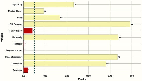 Association of participant characteristics with the knowledge level of gestational diabetes mellitus (GDM) (ci-square test). Horizontal bar charts represent the p-values for the association between participant characteristics and the knowledge level of GDM. Variables with statistically significant associations (p < 0.05) are shown in red. A vertical dashed blue line marks the significance threshold at 0.05. Significance is annotated as follows: ** p < 0.01, * p < 0.05, ns = not significant.