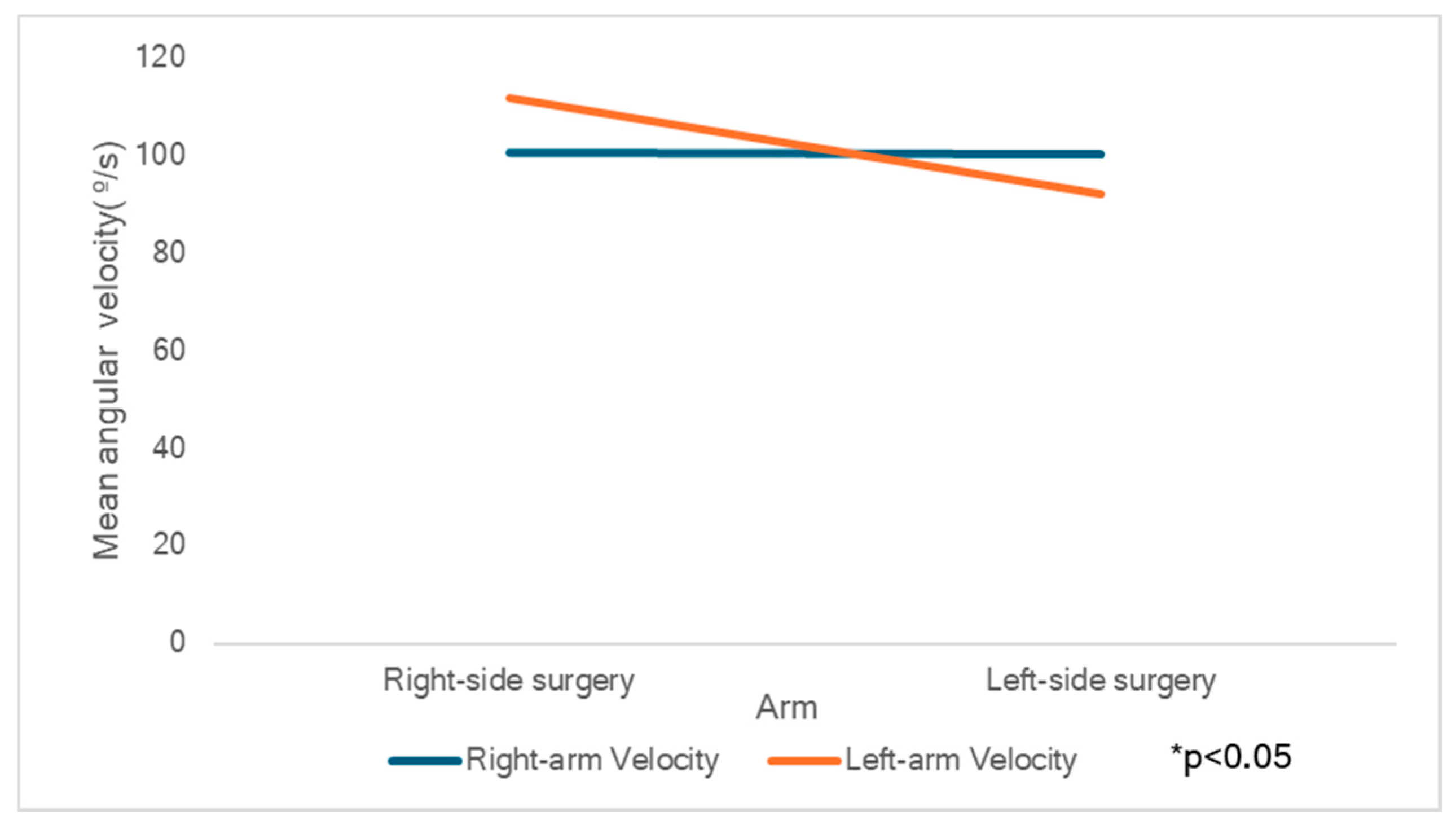 | Surgery Side | Right Arm (°/s) | Left Arm (°/s) | n | Hedges’ g [95% CI] |