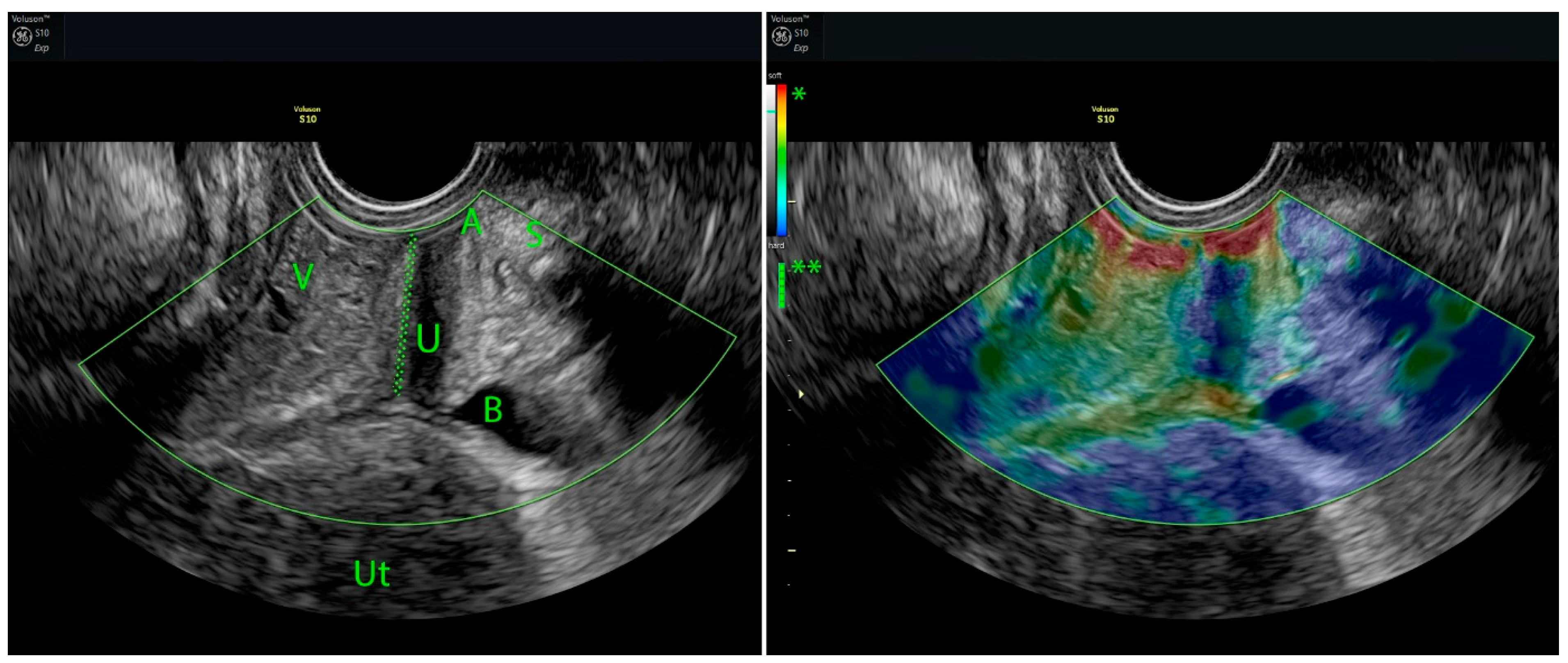 - Kreutzkamp, J.M.; Schäfer, S.D.; Amler, S.; Strube, F.; Kiesel, L.; Schmitz, R. Strain Elastography as a New Method for Assessing Pelvic Floor Biomechanics. Ultrasound Med. Biol. 2017, 43, 868–872. [Google Scholar] [CrossRef] [PubMed]