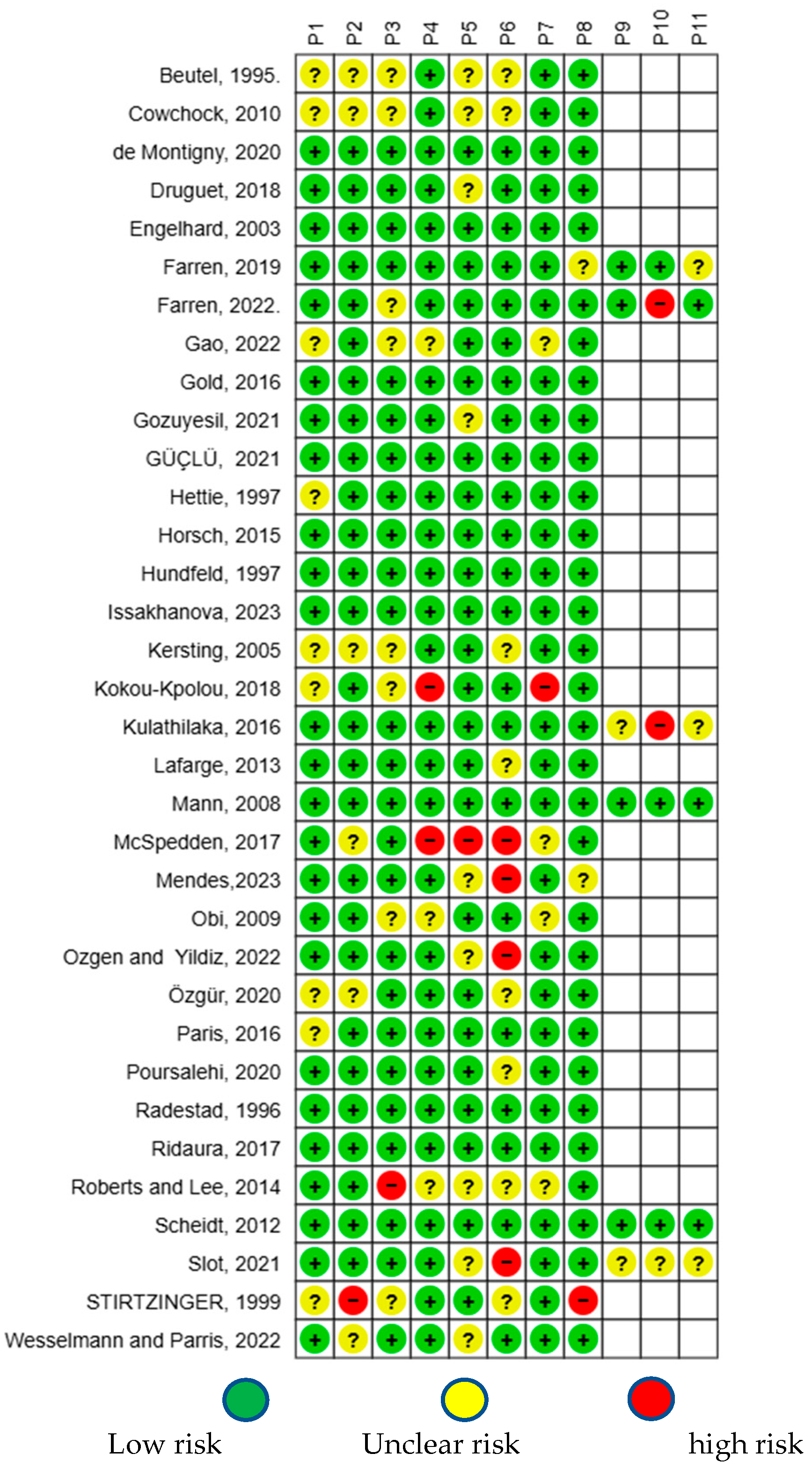 | Scheidt et al. * [47] | Sample: 31 women. Loss: 7 women (22.6%) had lost their child due to stillbirth, 13 (41.9%) due to miscarriage, and 11 (35.5%) due to pregnancy termination. Twelve women (38.7%) reported a history of prenatal or perinatal loss, and 18 women (58.1%) already had at least one healthy child. Sociodemographic characteristics: The majority (83.8%) reported that the pregnancy was planned, and 74.2% were married or in a stable partnership. Sixteen participants (51.6%) held a university or high school degree. | The mean age of the sample was 35.2 years (SD = 5.4). | One-way ANOVA, post hoc Kruskal–Wallis tests, Kazis’ d, Pearson or Kendall’s Tau-b correlation, nonlinear regression analysis, and nonlinear categorical regression model. | Social support was inversely associated with all outcomes except somatization. Relationship quality was linked to lower grief, anxiety, and depression. Secure attachment was associated with lower anxiety, depression, and PTSD, whereas insecure-preoccupied attachment was related to higher grief, anxiety, depression, somatization, psychological distress, and PTSD. The multivariate analysis results were: Grief: adjusted R2 = 0.57 (p = 0.005), psychological distress: adjusted R2 = 0.432 (p = 0.014), somatization: adjusted R2 = 0.698 (p = 0.016). In all cases, baseline scores were the strongest predictors at 9 months. Insecure-preoccupied attachment predicted PTSD symptoms (adjusted R2 = 0.416, p = 0.002). Social support explained 66.9% of the variance in depression and 45.2% in grief. For PTSD 2 (T4), only extreme preoccupied attachment scores predicted symptoms; values between -0.2 and 0.13 were not relevant. | The study presents preliminary data on the role of individual differences in attachment, social support, and the quality of the current relationship in coping with grief after perinatal loss. Attachment, social support, and relationship quality were found to influence the course of grief following a perinatal loss. |
