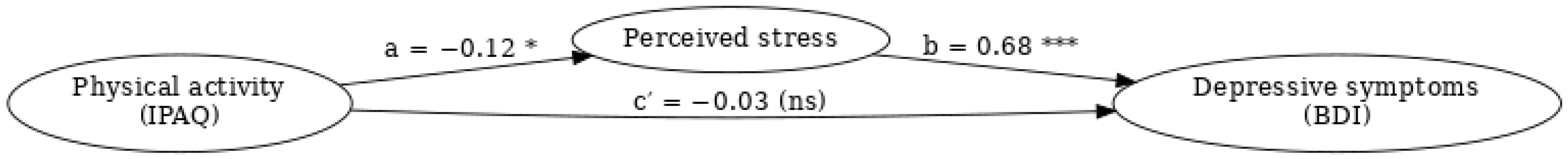 31]. Taken together, these results support a statistical mediation framework, in which perceived stress accounts for a substantial proportion of the observed association between physical activity and depressive symptom severity, without implying a causal mechanism.