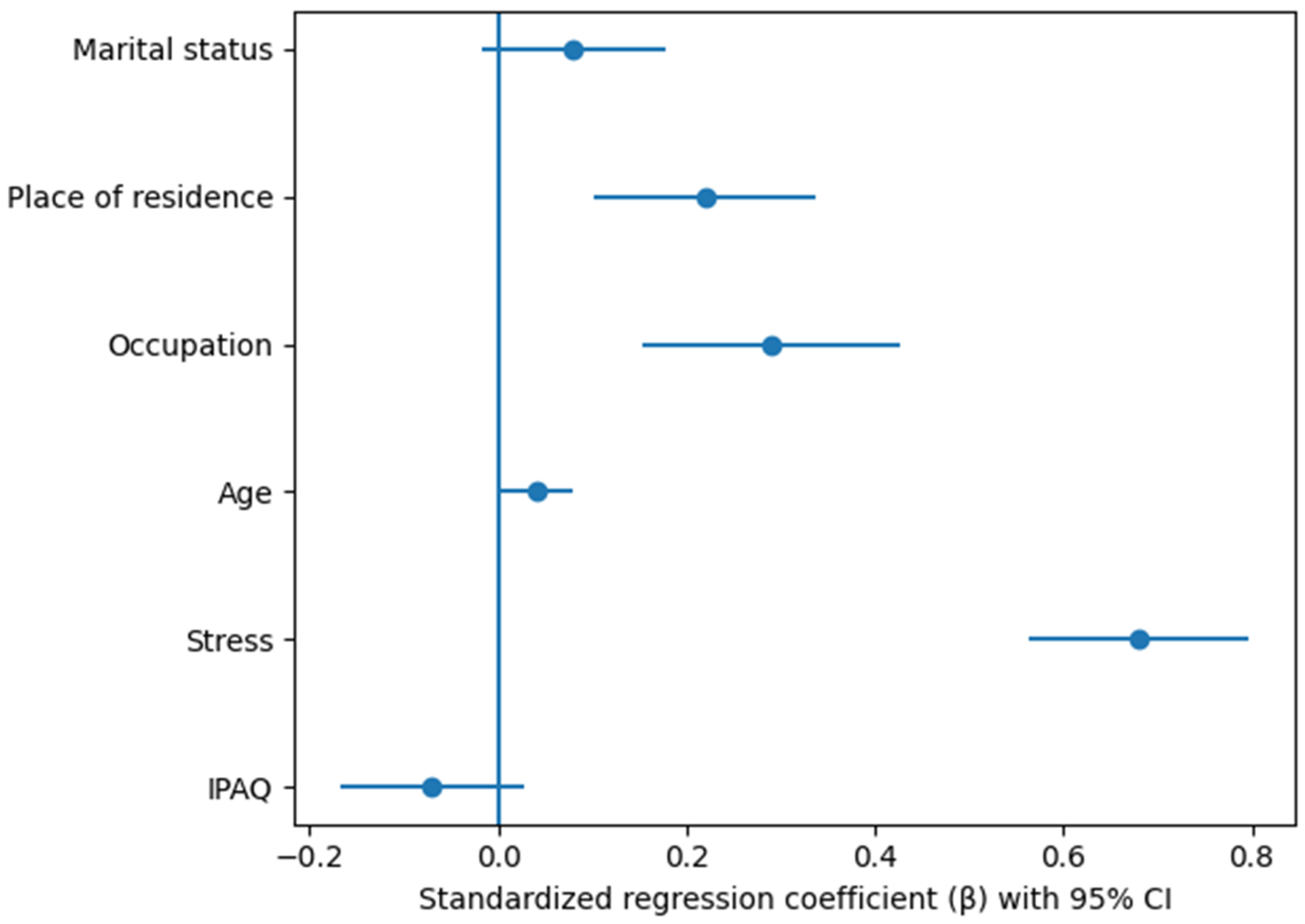 Physical activity, measured using the IPAQ, was characterised by a small negative regression coefficient (β = −0.07), suggesting a tendency for lower severity of depressive symptoms with increasing levels of physical activity. However, the 95% confidence interval included zero, indicating no significant direct effect of physical activity on depression after accounting for stress levels and sociodemographic factors. Age and marital status showed weak and statistically insignificant associations with the severity of depressive symptoms.