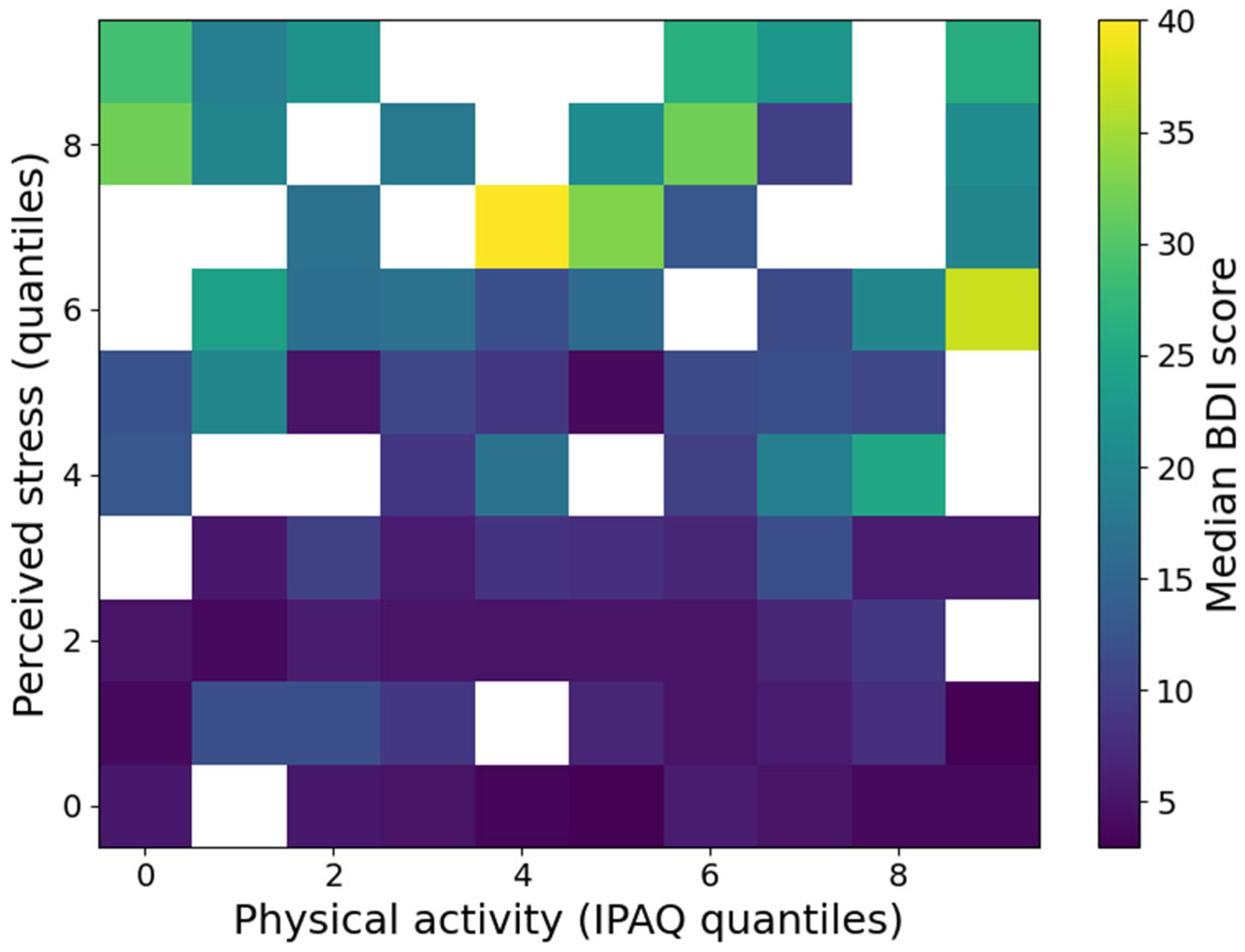 Figure 3. Analysis of the heat map revealed a clear interaction between physical activity and perceived stress in relation to the severity of depressive symptoms.