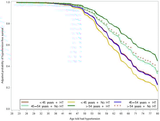Menopausal status was determined based on the self-reported age of the last menstrual period. Age at menopause was analyzed as a continuous variable and as a categorical variable (<45 years, 45 to 54 years, and >54 years) [17]. We evaluated self-reported information on age at the first menstrual period. We computed the duration of reproductive lifespan in years by subtracting age at menarche from age at menopause. Lastly, HT use was assessed by asking, “Have you ever used female hormones such as estrogen and progesterone? Please include any forms of female hormones, such as pills, cream, patch, and injectables, but do not include birth control methods or use for infertility.” To evaluate the combined effect of age at menopause and HT on hypertension onset we created six categories: (<45 years + HT); (<45 years + No HT); (45–54 years + HT); (45–54 years + No HT); (>54 years + HT); and (54 years + No HT) [18].
