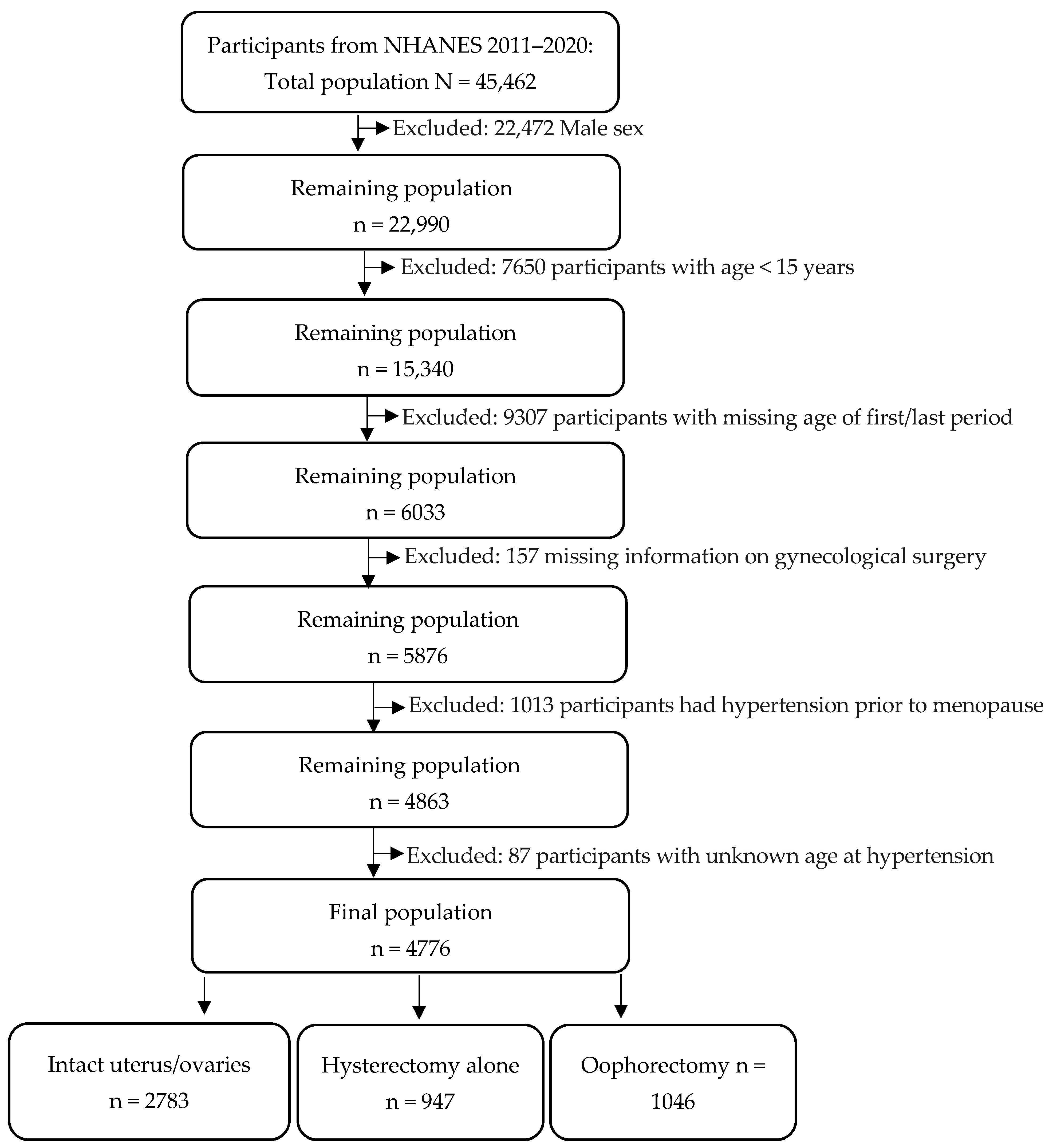 - Mustafa, A. Association between hysterectomy and hypertension among Indian middle-aged and older women: A cross-sectional study. BMJ Open 2023, 13, e070830corr1. [Google Scholar] [CrossRef] [PubMed]