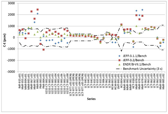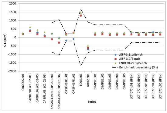 C-E results reported in colored points on the plots are given in pcm (10−5) and 3σ experimental uncertainties are reported in black dashed lines. The nomenclature used to name the experiments is taken from the ICSBEP Handbook.