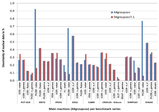 Nuclear data are one of the main sources of uncertainties in the calculation of reactor configurations. In this section, uncertainties of nuclear data have been propagated in terms of Δkeff using the TSUNAMI sequence [10] of the SCALE 6.2 package [11]. To compute the so called “prior uncertainty”, the TSUNAMI sequence uses sensitivity coefficients produced by the MORET 5.D.1 continuous energy code based on the IFP methodology (which is also implemented in the MCNP6.2 code [12]) but also covariance matrices. The covariance matrices express the uncertainty of nuclear data (diagonal terms) and the cross correlated uncertainties between isotopes and reactions (anti-diagonal terms). Two covariance matrices available in the SCALE 6.2 package were used in this study: the 44groupcov based on ENDF/B‑VII.0 and the 56groupcov7.1 based on ENDF/B-VII.1. The prior uncertainty for our selection of reactor physics experiments is reported in Table 2. The uncertainty can vary depending of the fissile media and reflectors. For KRITZ and EOLE experimental programs, which involve plutonium, higher prior uncertainty values are obtained with the 44groupcov covariance matrix. It is quite understandable since the 239Pu nubar has been strongly unrealistically reduced between the ENDF/B-VII.0 and ENDF/B‑VII.1 evaluations of nuclear data. For other series, the overall uncertainty is quite comparable. However, when looking at the main contributors to the uncertainty, the hierarchy depends of the covariance library. We chose to make the comparison for the 4–6 major contributors determined with the 44groupcov covariance library. Generally, 239Pu nubar, 238U (n,n′), 239Pu fission, 235U fission and 238U (n,gamma) are in the top list. However, this analysis allows for showing the impact of other nuclides (56Fe for IPEN and CABRI, 232Th for HCT-018, 167Er for CROCUS) as can be seen in Figure 3.