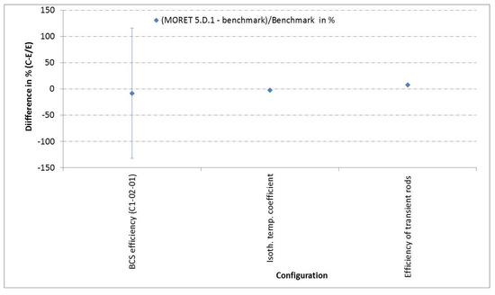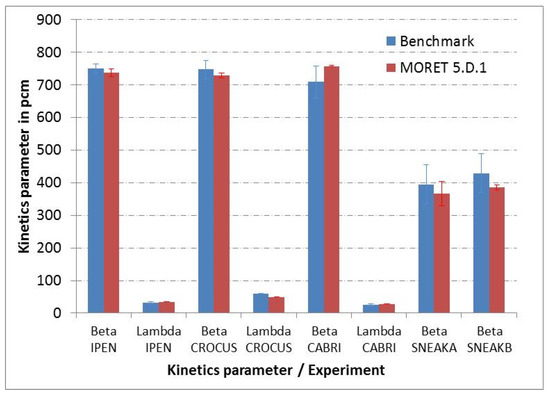 In Figure 4, one can see the comparison of both kinetics parameters. Quite good agreement is obtained between the benchmark value and the value calculated with the MORET 5.D.1 code using the ENDF/B‑VII.1 evaluation of nuclear data.