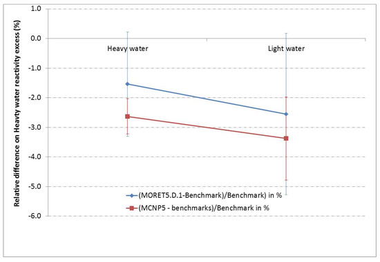 Similar conclusions can be drawn for the IPEN reactor where excess reactivity in light and heavy water are in good agreement with the benchmark within 3σ uncertainty margins using either the MORET 5 code or the MCNP5 code. Moreover, the MORET 5 and MCNP5 results overlap.