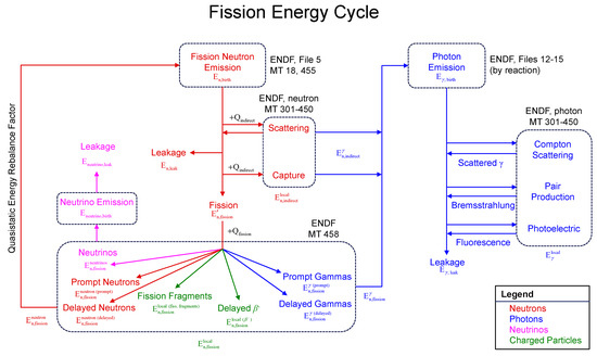 Illustration of energy release, deposition, and conversion mechanisms for neutrons, photons, charged particles, and neutrinos in a nuclear reactor. Evaluated Nuclear Data File (ENDF) reaction numbers (i.e., MT numbers) associated with energy release/deposition are listed for each reaction category.