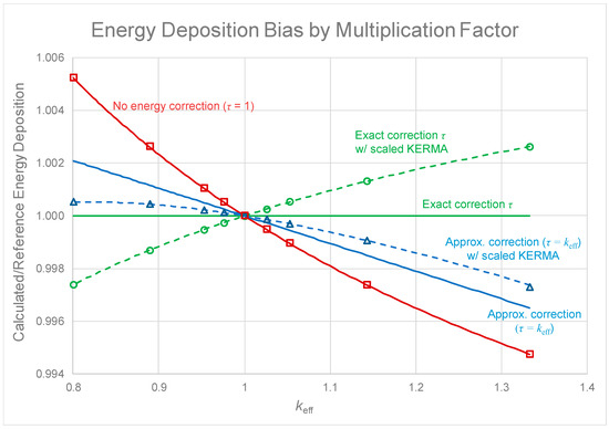Energy deposition bias as a function of multiplication factor for an infinite, homogeneous, two-nuclide test problem. Theoretical results are provided for three energy correction schemes (no correction, approximate, and exact), and for reference (solid lines) and scaled KERMA values (dashed lines). Corresponding numerical results from an MC21 calculation are shown as open markers for selected conditions.