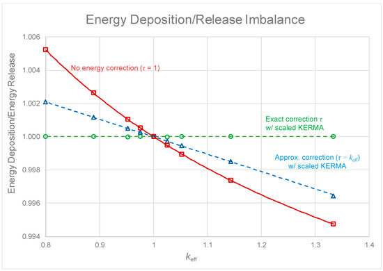 Energy deposition to release imbalance as a function of multiplication factor for an infinite, homogeneous, two-nuclide test problem. Theoretical results are provided for three energy correction schemes (no correction, approximate, and exact), and for reference (solid lines) and scaled KERMA values (dashed lines). Corresponding numerical results from an MC21 calculation are shown as open markers for selected conditions.