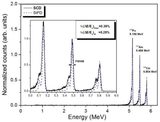 Soon after the year 2000, the development and commercial availability of high-quality homoepitaxial diamond films (SCD) allowed for a quick and impressive improvement of the detection performances of diamond detectors, i.e., “100% charge collection efficiency and energy resolution <0.4%” [,], thus comparable to that of silicon (see Figure 1), and consequently paved the way for the application of diamond detectors in different research fields. The high-quality artificial diamond layers are usually referred to as “electronic grade” diamond.