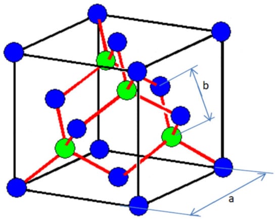 The first point to consider when growing artificial diamond is that the stable phase of carbon is graphite, which has a planar sp2 hybridization. Diamond, in turn, results in the metastable allotropic form of carbon, and it is characterized by having a sp3 hybridization, which is a 3D configuration. Consequently, diamond atoms are arranged in a crystal structure (lattice) in which each carbon atom has four nearest neighbors in the typical tetrahedral arrangement, the so-called face-centered cubic lattice structure (Figure 2). There are eight atoms per unit cell, the nearest neighbor distance is b = 1.54 Å, and the unit cell dimension, at 298 K, is a = 3.567 Å (see Figure 2). There are 1.77 × 1023 atoms/cm3; this is the highest atomic density of any material (in the earth). The diamond density, at 298 K, is 3.515 g/cm3 [,].