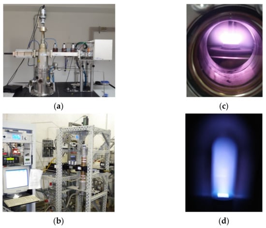 (a) Picture of a MWPECVD deposition system operating at ENEA C.R. Frascati (Italy) and (b) at University of Rome “Tor Vergata” (Italy); (c,d) picture the diamond deposition on the growing substrate located inside vacuum chamber (a,b), respectively.