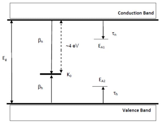 Energy band structure of diamond with some important quantities indicated: Eg is the band gap (eV); K0 indicates a deep trap; βn,h are the decay time of the K0 deep level (for electrons and holes, respectively); EA1 and EA2 indicate the energy levels of shallow traps for electrons and holes, respectively; τn and τh are the trapping times for EA1 and EA2 levels, respectively.