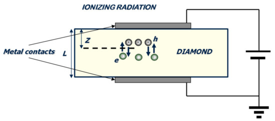 A typical diamond detector, in its simpler form, is a two-terminals device formed by an intrinsic diamond layer sandwiched between two metal contacts (Figure 5). The high specific resistivity of diamond (>1013 Ω·cm) allows for a very simple construction of the detector, which renders the diamond detector a “solid state ionization chamber”.