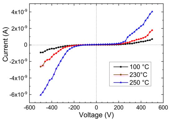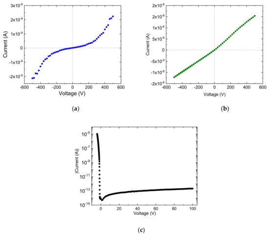 A straightforward approach to studying the performances of electrical contacts before exposure to radiation is the measurements of the I-V characteristics versus biasing voltage. As an example, Figure 6a shows the typical I-V curve for a 500 μm thick detector fabricated with two Schottky metal contacts (Pt-Pt), to note the typical (double) diode shape. Figure 6b shows typical ohmic I-V characteristics measured for a 500 μm thick diamond detector with Ag-Ag contacts post deposition annealed in vacuum at 600 °C. The I-V curves for the “layered” detector (boron doped/intrinsic diamond/Al), shown in Figure 6c, exhibit the typical (rectifying) Schottky diode curve.