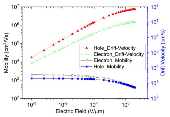Other values for the mobility of holes and electrons in diamond are available in the literature [,,]. For example, according to Jansen [], at 295 K, the low field electron mobility is μ0e = 1440 cm2/Vs, and, as for the Pernegger data, it is lower than the hole mobility (μ0h = 2280 cm2/Vs). References [,] reported a range of measured mobility data, e.g., at room temperature, the electrons’ mobility (3500 < μ0h < 4500 cm2/Vs) was generally higher than the hole mobility (2600 < μ0e < 3800 cm2/Vs). The observed differences could be ascribed to the different type/quality of diamond crystals used as well as to different experimental conditions.