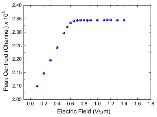When testing a diamond detector, the first step is to determine the external voltage (HV), e.g., by using an 241Am alpha source, which emits alpha particles of 5.5 MeV. In this case, locating the 241Am alpha source close to one of the electrodes, e.g., the one at positive potential, a typical result is that the peak centroid of the alphas pulse height spectrum (PHS) moves toward higher values as E increases (i.e., increase in the HV). The peak shifting is observed until it reaches a saturating value for the E (HV), above which the peak position is scarcely sensitive to its further increase (Figure 8).