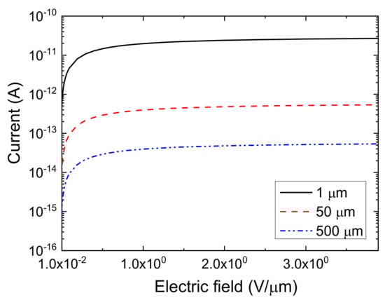 This is the so-called effective mobility; Equation (5) is also plotted in Figure 7. Equation (5) is valid in the same range for E where Equation (4) applies. According to Equation (5), the charge carrier mobility is highest at low E field strength and gradually decreases as E increases, as found experimentally by Pernegger (see Figure 4b in []). Let us note that, for diamond, the mobility for holes is the highest amongst the semiconductors. Pernegger, fitting the experimental data of the measured vd in the range 0.2 V/μm < E < 1.5 V/μm (which is the range for E where the drift velocity approaches the saturation velocity), reported values of μ0e = 1714 cm2/Vs and μ0h = 2064 cm2/Vs for electrons and holes mobility, respectively, at room temperature. μ0e and μ0h are the so-called low field mobility, that is, the mobility for E < 0.1 V/μm. The reduction of the carrier’s mobility versus the electrical field is generally observed in semiconductors.