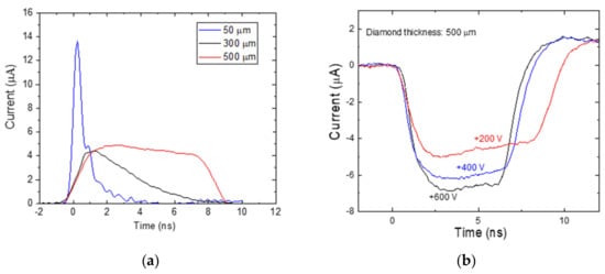 A biasing voltage (HV) is applied between the two electrodes, typically of the order of 0.5–2 V/μm. Too-high HV can affect the detector response (Section 3.2 and Section 3.3). Different metals can be used to deposit the contacts (the so-called metallization procedure, see Werner []), the most common being Al, Cr, Ti, Ni, Ag, Au, Pt, and W. Typical metal layer thickness is in the range 30 ÷ 200 nm. Often, two (or even three) layers of different metals are used to form a layered metal electrical contact (e.g., Ti/Pt/Au, Cr/Au, etc.). In this case, the thinner metal layer is deposited directly on top of the diamond surface, while the thicker one is on top of the first metal layer; the latter is used to avoid the oxidation of the first one (e.g., Cr/Au) or to improve the mechanical and/or thermal properties and also detector bonding/contacting.