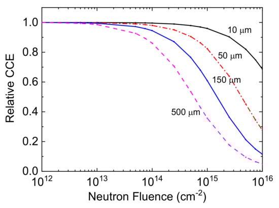Equation (13) is interesting because it shows that the collected charge Qc (hence CCE) is inversely dependent from the diamond film thickness L. We will see in the next sections that most of the properties of diamond detectors are depending upon 1/L. Equation (13) also shows that we can define a collection distance for each carrier (λce and λch, respectively), furthermore pointing out a relationship between E and the ccd, which, accounting for Equation (5), is not linear. This is experimentally observed. Considering the temperature dependence of mobility, we can conclude that the ccd is a function of both E and T.