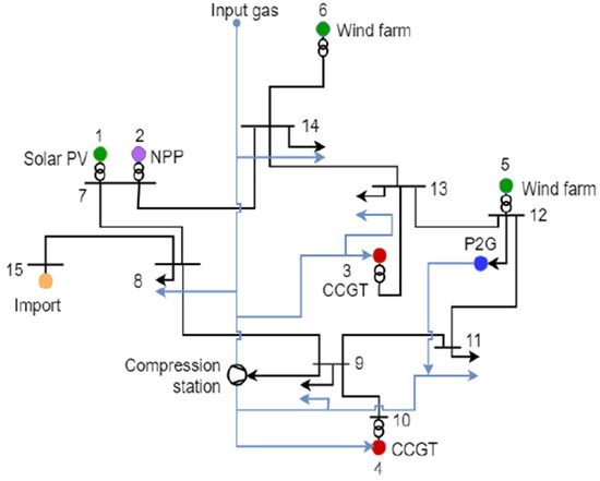 We consider an IES of literature [6] comprised of two Combined Cycle Gas Turbine (CCGTs) plants, a NPP, two Wind Farms (WFs), a Solar Photovoltaics (PV) field and a Power-to-gas (P2G) station. The IES considered is plotted in Figure 1 (where the black line is the electrical grid and the blue line is the gas grid). We assume that the IES can have four different configurations depending on the type of NPP that is therein integrated: a cNPP consisting of a single 360 MWe large reactor unit, or three alternative aNPPs consisting of multiple identical SMR units, for the same total nameplate capacity of 360 MWe. The cNPP and aNPPs differ in terms of number of reactor units (i.e., 1, 2 or 4) and design features (e.g., size, reactor vessel layout, aspect ratio, level of reactor building, etc.), thus meeting some (or all) the FRs presented in Section 2, as listed in Table 3. For each configuration, the benefit on the IES resilience of different SMR technologies is, hereafter, compared to that of a typical large reactor, with respect to several realistic accidental scenarios that might be triggered by the occurrence of a generic NaTech event, e.g., initiated by an earthquake, a tsunami, etc.