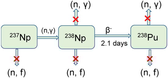 Chain of isotopic transformations under neutron irradiation of 237Np. The symbol «X» designates the undesirable processes for 238Pu production.