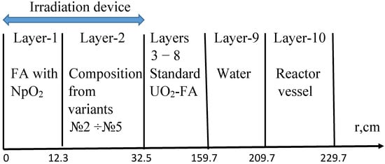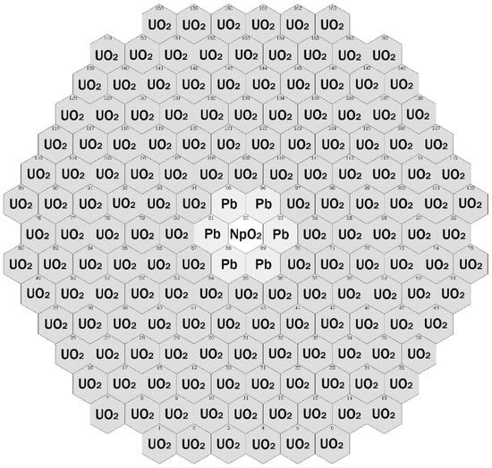 The following variants were analyzed: (1) the reactor core without the irradiation device; (2) central NpO2-FA surrounded by six Pb-FA; and (3) central NpO2-FA surrounded by six 208Pb-FA. The gap between the reactor core and the reactor vessel was filled up with light water. The results are presented in Figure 10 and Figure 11.