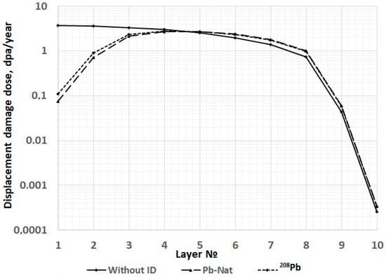 - Replacement of natural lead by lead isotope 208Pb in six FA around the central NpO2-FA can insignificantly decrease the displacement damage dose in the reactor vessel because of the better neutron slowing down properties of 208Pb.