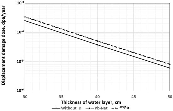 Figure 11 shows the change in value of the DDD for the reactor vessel with an increase in thickness of the water layer (layer 9) from 30 to 50 cm.