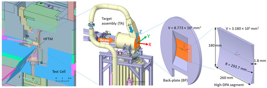 A neutronic model of the particle transport code MCNP [7] has been used, which consists of a detailed geometry of the TA, HFTM, and the surrounding TC shielding (see Figure 2). It was generated by the engineering CAD model employing the CAD-to-MC geometry conversion tool McCad [8]. The McDeLicious code [9], which is an extension of MCNP version 6.2 with the ability to simulate the deuterium–lithium neutron source based on evaluated d + 6,7Li cross sectional data [10], was employed for the calculations. The neutron cross section library FENDL-3.1d [11] has been used for the neutron transport calculations. To calculate the displacement damage of the Eurofer steel, dedicated displacement cross sectional data based on the NRT model were used [12], which are recommended as the reference data for the design analysis of the European DEMO project and the IFMIF-DONES project [13,14].