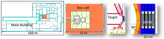 Neutronic geometries of the IFMIF-DONES building and the test cell in horizontal cut-view, and target assembly, HFTM, and BP in vertical cut-view.