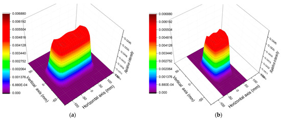 Deuteron beam footprints with normalized intensity. (a) “20 × 5” footprint; (b) “10 × 5” footprint.