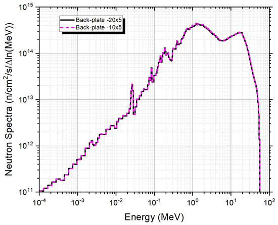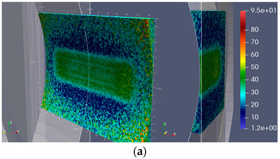 The MC simulations were executed on the supercomputer MARCONI hosted at the CINECA computational center in Italy. A total number of 2 × 109 particle histories were sufficient for lowering the relative errors of the whole mesh to <2%. The neutron spectra under the two footprints are provided in Figure 4. The isometric view of Figure 5 at the central region provides damage rates higher than 30 dpa/fpy, and the cut-view shows values as high as 40 dpa/fpy with a maximum value for Li. Since the DPA values in Li are not meaningful, the data on the BP had to be extracted using a data-mapping approach.