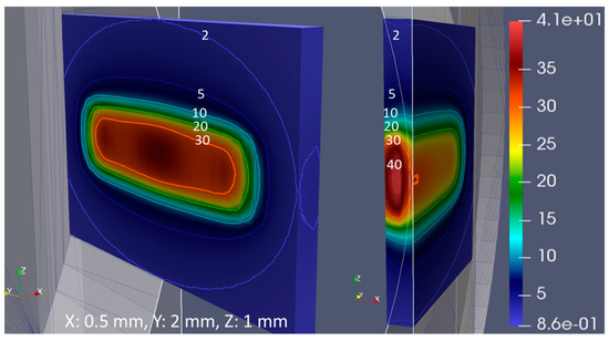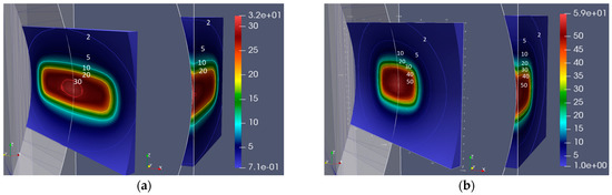 Superimposed mesh tallies were established, covering the high-DPA segment of the BP. They have fine resolutions of 0.05 cm × 0.2 cm × 0.1 cm in the X, Y, and Z directions, as shown in Figure 1, particularly in the X direction, which is meant to capture the curvature of the BP. The neutron fluxes were multiplied with the Eurofer displacement cross section internally in the MCNP code, producing a DPA map that assumes Eurofer covers the whole mesh. This approach avoids the unphysical value produced at the curvature boundary, where the mesh cells are mixed with Eurofer and Li. An additional interpolation approach was employed to map the DPA from the mesh tally to the BP geometry, which will be discussed in the next section. Besides DPA, the helium and hydrogen productions were calculated with the same mesh as DPA. Two deuteron beam footprints—the nominal 20 cm × 5 cm footprint (“20 × 5”) and reduced 10 cm × 5 cm (“10 × 5”)—were used for this simulation, as shown in Figure 3, which are so-called “IFMIF/EVEDA” beam footprints [9]. The “10 × 5” footprint is the “20 × 5” footprint scaled by half on the horizontal beam width.