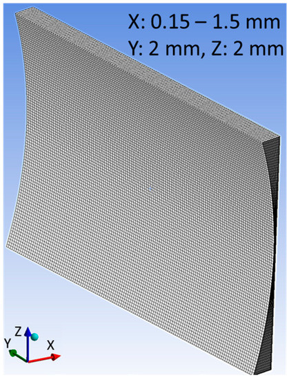 Hexahedral mesh of the high-DPA BP segment. Mesh resolutions are X: 0.15–1.5 mm, Y: 2 mm, and Z: 2 mm, which provide similar resolutions as the mesh tallies to maintain the data’s fidelity.